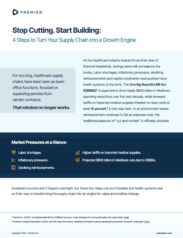 For too long, healthcare supply chains have been viewed as back-office cost centers—focused on squeezing pennies from vendor contracts. That mindset no longer works. As the industry braces for another year of financial headwinds, savings alone won’t balance the books. Labor shortages, inflationary pressures, declining reimbursements and capital constraints have pushed many health systems to the brink. The One Big Beautiful Bill Act (OBBBA) is projected to drive nearly $800 billion in Medicare spending reductions over the next decade, while renewed tariffs on imported medical supplies could raise costs by at least 15 percent in the near term. In an environment where reimbursement is shrinking as expenses soar, the traditional playbook of “cut and contain” is officially obsolete. This essential guide outlines the four strategic steps leading organizations are taking to transform their supply chains into engines for growth and resilience—leveraging data, technology and clinical integration to deliver total enterprise value. You’ll learn how to: